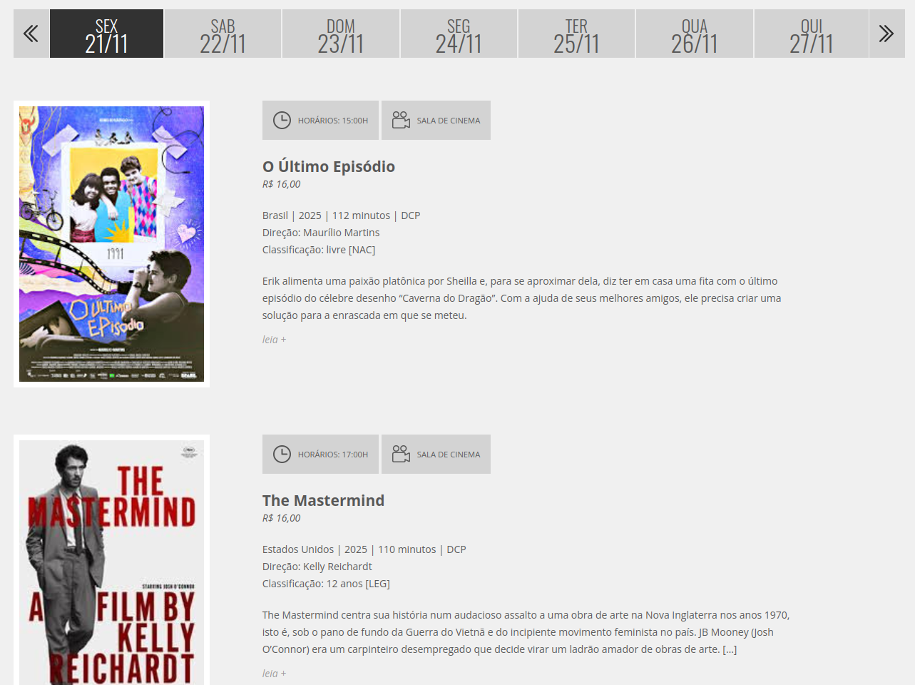 | 23 minutos | DCP Direção: Adalberto Oliveira Classificação: Livre Rapacidade é um filme-ensaio
